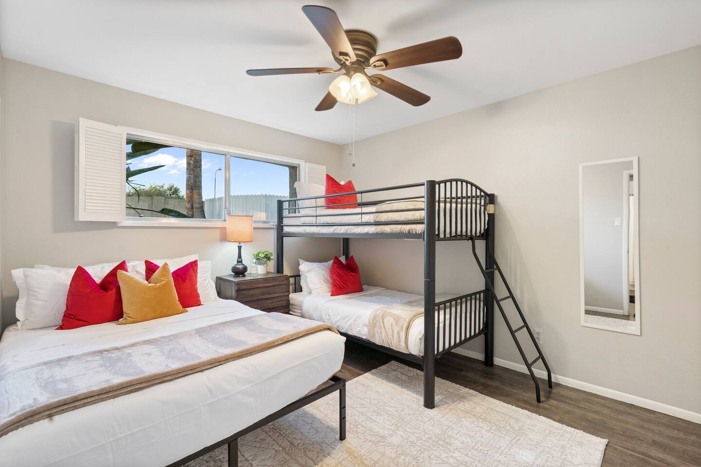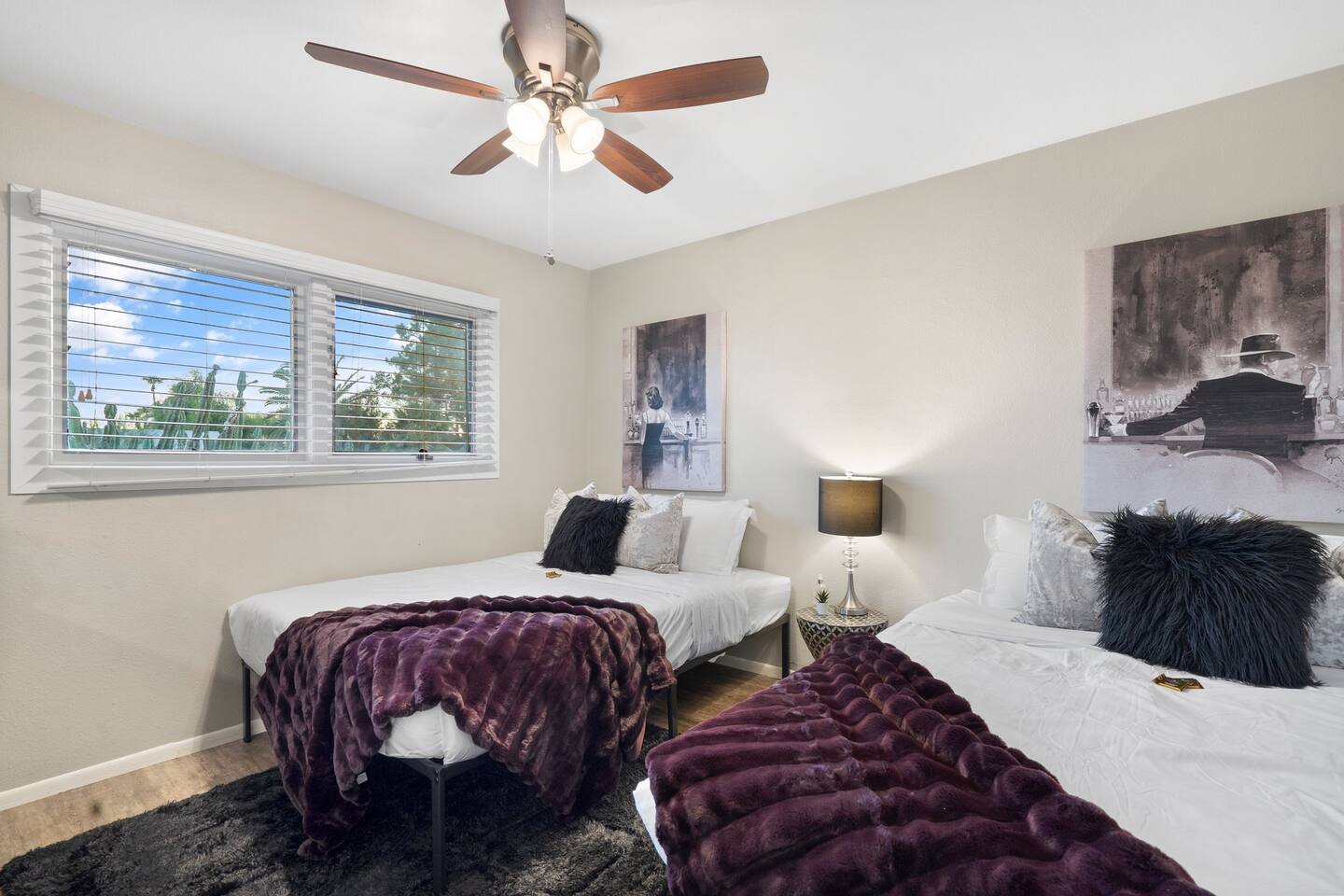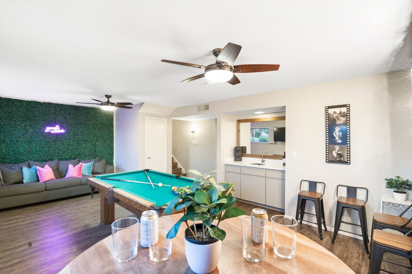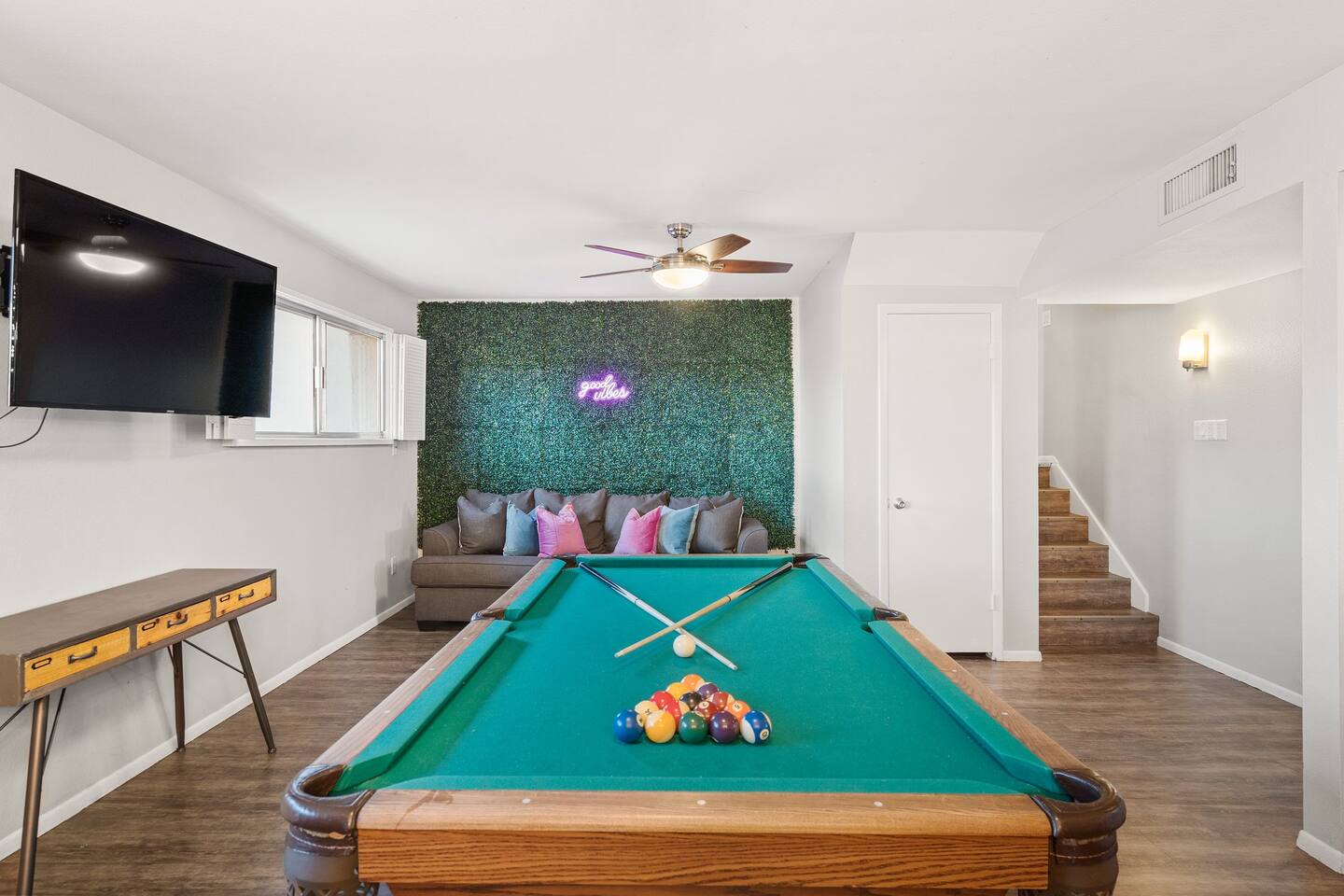 Whether you are taking that annual family vaca, going on a golf trip with your buddies or planning your besties bachelorette party, this 4 bedroom, 3.5 bath, tri-level Scottsdale home, complete with game room, outdoor dining area with built-in bar and grill, indoor and outdoor games, large heated pool & hot tub has something for everyone! Plus an experienced, local host who will ensure your trip to Scottsdale is memorable & stress-free! And only 3 miles to Old Town nightlife, bustling bars, hip restaurants, & world-class shopping, it’s the perfect location to enjoy all the fun & unique things for which Old Town is famous (while still enjoying peace & relaxation while your home!). If you are traveling with little ones, we got you covered! Available for our guests's use is a pack n play with sheets, a booster seat, toys, games and books so the little ones can stay entertained and you have less packing stress! All of the bedrooms have been furnished with brand new, memory foam mattresses, exquisite linens and soft cozy blankets to ensure you get your best night's sleep! The master bedroom en-suite, situated upstairs, is outfitted with a king size bed, dresser and extra large, wall-to-wall closet with multiple height bars and shelves, perfect for storing all of your personal belongings. The attached private bathroom has a standing shower & is stocked with all of the essentials like fresh, clean towels, makeup cloths, shampoo, conditioner, body wash, hairdryer & more. The second bedroom has a peaceful aesthetic in shades of green and cream and features a framed gallery of modern art prints over 2 queen sized beds. There is a large dresser and full length closet with double doors, perfect for storing all of your belongings. The 3rd upstairs bedroom, the "glam room," also has 2 queen beds, closet and dresser for storage. All of the bedrooms have ceiling fans and full-length mirrors. The large upstairs guest bathroom has a bathtub and shower combo and double sink vanity. Also stocked with all of the essentials like fresh, clean towels, makeup cloths, shampoo, conditioner, body wash, hairdryer & other toiletries, you will have everything you need here so you can pack light! The main level features a large, open floor plan with a living room, dining room, kitchen, laundry room and half bathroom. The living room has an extra long L-shaped couch with enough seating room for everyone! The large, wall-mounted smart TV will allow you to stream all of your favorite programs, sports events or music and the fireplace is perfect to cozy up next to with a book during the chilly Arizona winter nights. The newly remodeled, spacious and fully-loaded kitchen has ample counter space for preparing and serving meals, new stainless steel appliances, spices and cooking oil, a coffee and tea nook and a long breakfast bar with stools which are perfect for a quick breakfast or for a serving area. The dining room, directly adjacent to the kitchen, seats 10-12 people so your entire group can dine together. The laundry room features a full-sized washer and dryer complete with laundry essentials like detergent, fabric softener and dryer sheets. Open up the double glass patio doors in the dining room for direct access to the large, covered patio. The backyard space opens up to the dining area which features a table for 6, wall-mounted, smart TV, a large bar with built-in drink cooler to keep all of your beverages ice cold, & plenty of bar stools and counter space for the entire group! The built in gas grill is directly adjacent to the dining space making serving your favorite BBQ meals a breeze (a small charcoal grill is also available). Outdoor games will keep everyone entertained and the pool-side loungers and sun umbrellas will allow you to enjoy as little or as much sun as you like. In the evening, toast some smores (or just get yourself toasty!) next to the outdoor firepit or take a relaxing soak in the large hot tub! The downstairs level of the home features a large game room with wall-mounted smart TV, pool table, lots of board games, wet bar, plenty of seating and a super cool grass wall with a neon "good vibes only” sign...the perfect back-drop for all your vacay photos! Get ready for a night out in Old Town in the makeup room because you’re like, really pretty! With room for 8, each prepping station is complete with a pink velvet stool, lighted tri-fold mirror and a heat resistant pad for all your hot tools. The downstairs bedroom features a twin bunk bed and full-sized bed, large closet and small dresser for storage, full-sized mirror and ceiling fan. The dedicated workspace is located in the downstairs bedroom and is complete with a writing desk, chair and printer to tackle all of your "work from home” tasks. There is a full bathroom downstairs with a bathtub and shower combo and all of the essentials like fresh, clean towels, makeup cloths, shampoo, conditioner, body wash, hairdryer & more. **Pool heating is available. There is a $50/day charge to heat the pool to a max of 85 degrees** This property is equipped with a Minut which measures the decibel levels in our home. The city of Scottsdale limits the number of occupants at a vacation rental to 6 adults plus their related dependent children. TPT licnese #:21479274 City of Scottsdale permit #:2023558