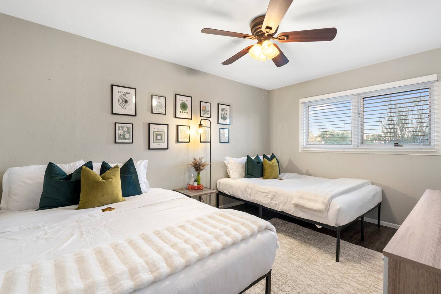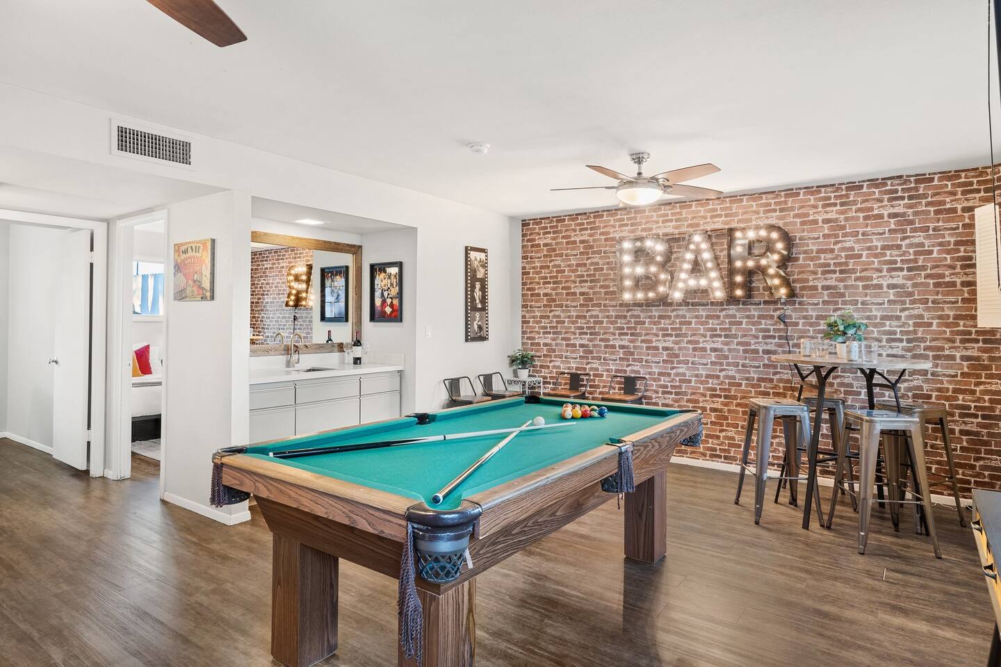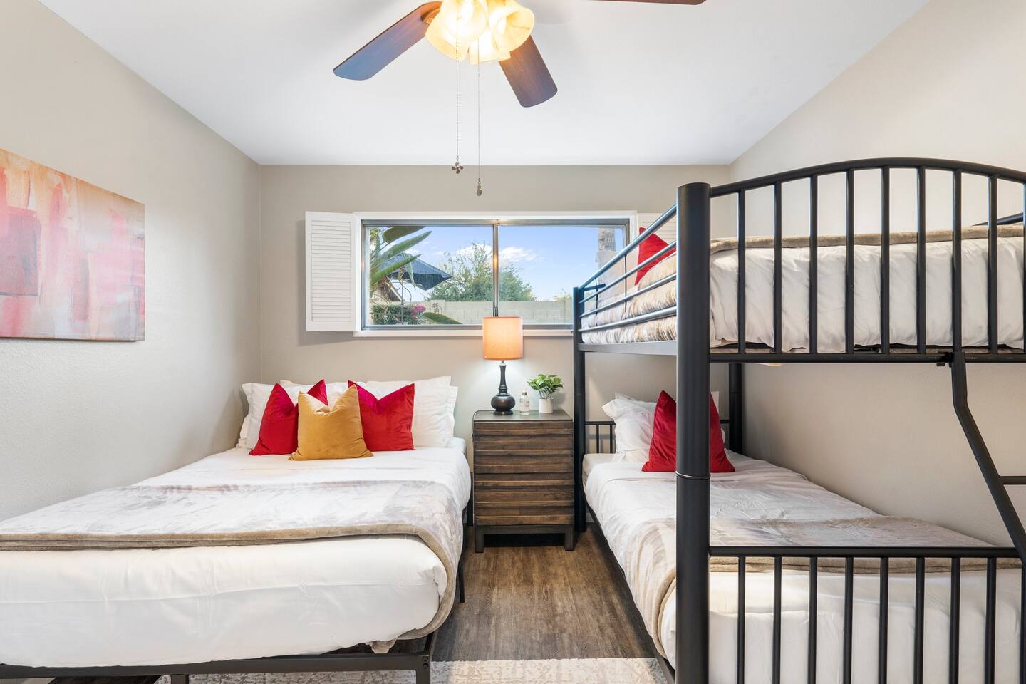Whether you are taking that annual family vaca, going on a golf trip with your buddies or planning your besties bachelorette party, this 4 bedroom, 3.5 bath, tri-level Scottsdale home, complete with game room, outdoor dining area with built-in bar and grill, indoor and outdoor games, large heated pool & hot tub has something for everyone! Plus an experienced, local host who will ensure your trip to Scottsdale is memorable & stress-free! And only 3 miles to Old Town nightlife, bustling bars, hip restaurants, & world-class shopping, it’s the perfect location to enjoy all the fun & unique things for which Old Town is famous (while still enjoying peace & relaxation while your home!). If you are traveling with little ones, we got you covered! Available for our guests's use is a pack n play with sheets, a booster seat, toys, games and books so the little ones can stay entertained and you have less packing stress! All of the bedrooms have been furnished with brand new, memory foam mattresses, exquisite linens and soft cozy blankets to ensure you get your best night's sleep! The master bedroom en-suite, situated upstairs, is outfitted with a king size bed, dresser and extra large, wall-to-wall closet with multiple height bars and shelves, perfect for storing all of your personal belongings. The attached private bathroom has a standing shower & is stocked with all of the essentials like fresh, clean towels, makeup cloths, shampoo, conditioner, body wash, hairdryer & more. The second bedroom has a peaceful aesthetic in shades of green and cream and features a framed gallery of modern art prints over 2 queen sized beds. There is a large dresser and full length closet with double doors, perfect for storing all of your belongings. The 3rd upstairs bedroom, the "glam room," also has 2 queen beds, closet and dresser for storage. All of the bedrooms have ceiling fans and full-length mirrors. The large upstairs guest bathroom has a bathtub and shower combo and double sink vanity. Also stocked with all of the essentials like fresh, clean towels, makeup cloths, shampoo, conditioner, body wash, hairdryer & other toiletries, you will have everything you need here so you can pack light! The main level features a large, open floor plan with a living room, dining room, kitchen, laundry room and half bathroom. The living room has an extra long L-shaped couch with enough seating room for everyone! The large, wall-mounted smart TV will allow you to stream all of your favorite programs, sports events or music and the fireplace is perfect to cozy up next to with a book during the chilly Arizona winter nights. The newly remodeled, spacious and fully-loaded kitchen has ample counter space for preparing and serving meals, new stainless steel appliances, spices and cooking oil, a coffee and tea nook and a long breakfast bar with stools which are perfect for a quick breakfast or for a serving area. The dining room, directly adjacent to the kitchen, seats 10-12 people so your entire group can dine together. The laundry room features a full-sized washer and dryer complete with laundry essentials like detergent, fabric softener and dryer sheets. Open up the double glass patio doors in the dining room for direct access to the large, covered patio. The backyard space opens up to the dining area which features a table for 6, wall-mounted, smart TV, a large bar with built-in drink cooler to keep all of your beverages ice cold, & plenty of bar stools and counter space for the entire group! The built in gas grill is directly adjacent to the dining space making serving your favorite BBQ meals a breeze (a small charcoal grill is also available). Outdoor games will keep everyone entertained and the pool-side loungers and sun umbrellas will allow you to enjoy as little or as much sun as you like. In the evening, toast some smores (or just get yourself toasty!) next to the outdoor firepit or take a relaxing soak in the large hot tub! The downstairs level of the home features a large game room with wall-mounted smart TV, pool table, lots of board games, wet bar, plenty of seating and a super cool grass wall with a neon "good vibes only” sign...the perfect back-drop for all your vacay photos! Get ready for a night out in Old Town in the makeup room because you’re like, really pretty! With room for 8, each prepping station is complete with a pink velvet stool, lighted tri-fold mirror and a heat resistant pad for all your hot tools. The downstairs bedroom features a twin bunk bed and full-sized bed, large closet and small dresser for storage, full-sized mirror and ceiling fan. The dedicated workspace is located in the downstairs bedroom and is complete with a writing desk, chair and printer to tackle all of your "work from home” tasks. There is a full bathroom downstairs with a bathtub and shower combo and all of the essentials like fresh, clean towels, makeup cloths, shampoo, conditioner, body wash, hairdryer & more. **Pool heating is available. There is a $50/day charge to heat the pool to a max of 85 degrees** This property is equipped with a Minut which measures the decibel levels in our home. The city of Scottsdale limits the number of occupants at a vacation rental to 6 adults plus their related dependent children. TPT licnese #:21479274 City of Scottsdale permit #:2023558