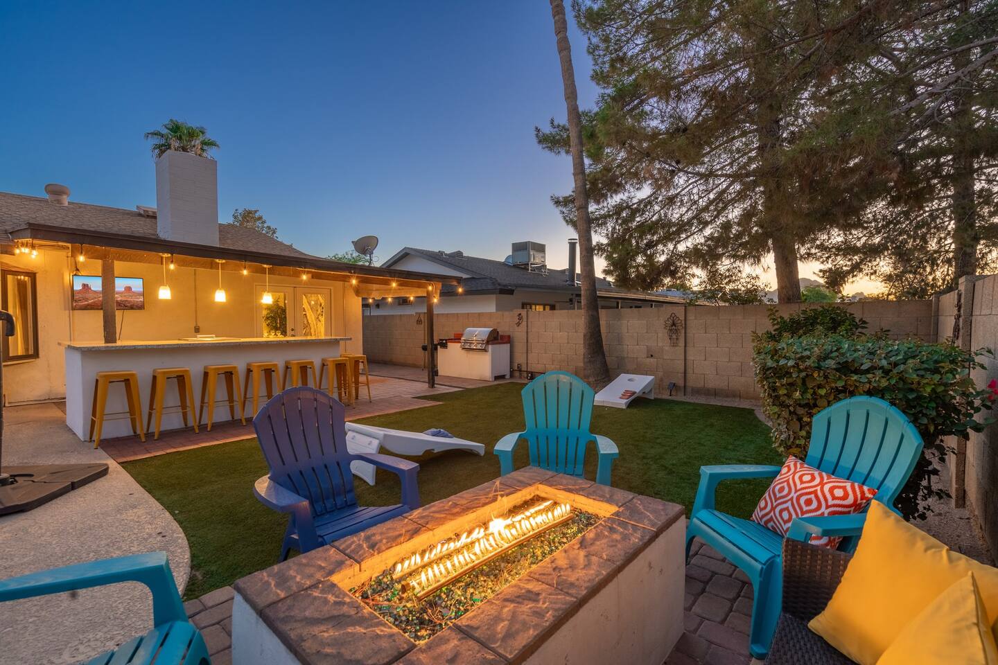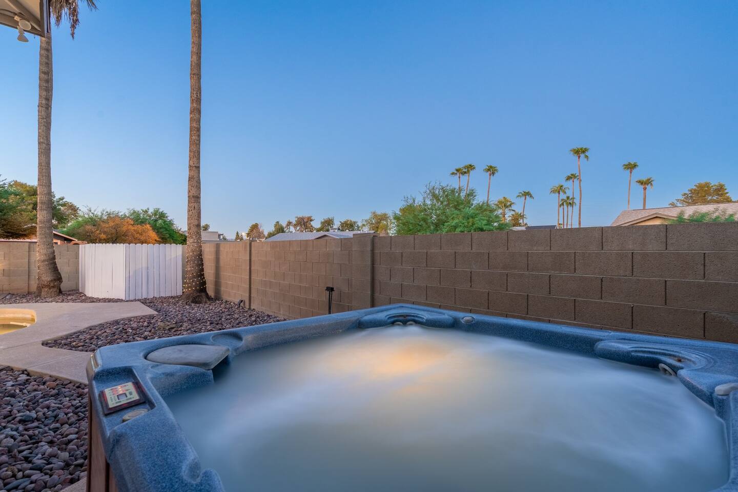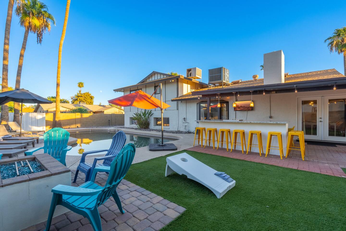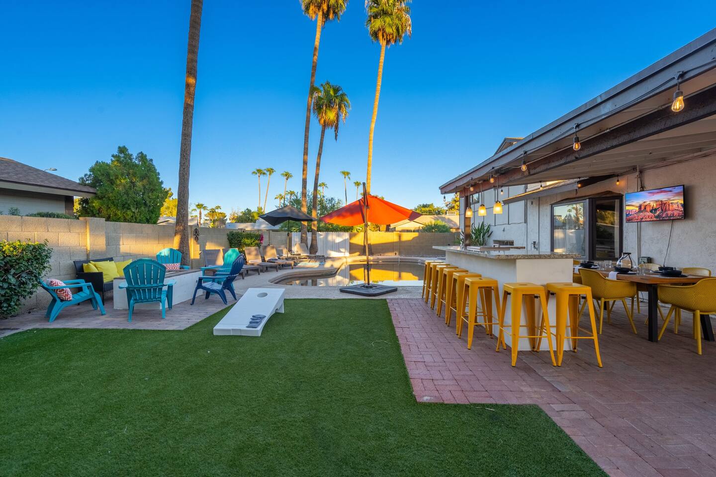 This must be the place! The Scottsdale retreat you have been searching for with all the comforts of home! This handsomely appointed, tri-level home sits on a huge corner lot less than 3 mi. from all the fun and excitement Old Town is famous for. Lounge poolside in the spacious backyard, complete with dining area, large smart TV, built-in gas grill, corn hole, fire pit & ambient lighting. Grab a floatie & veg out in the heated pool or soak your worries away in the relaxing hot tub.