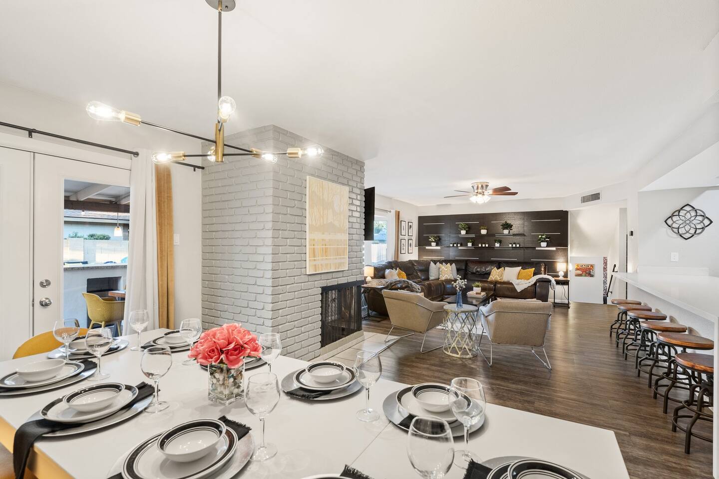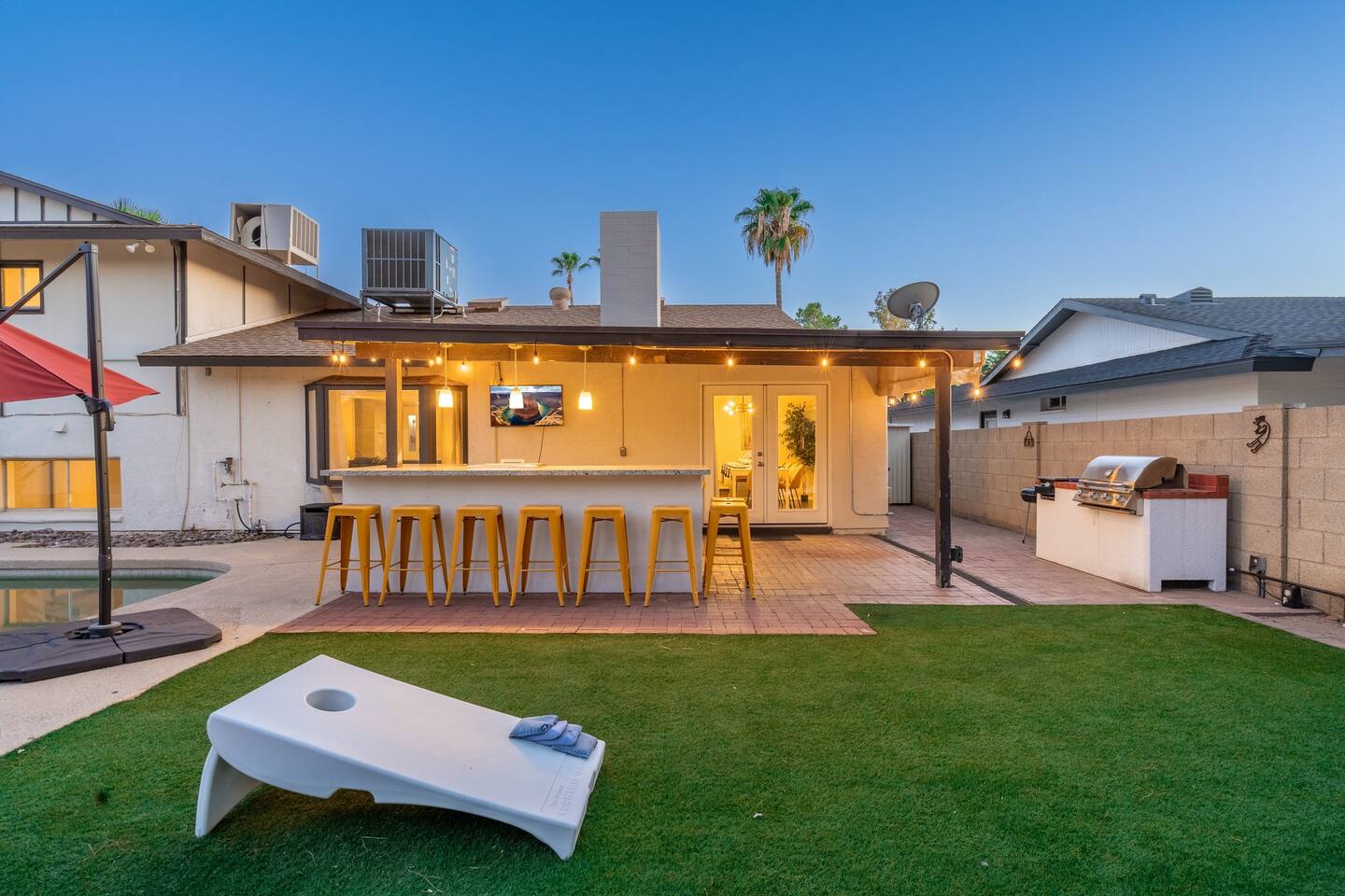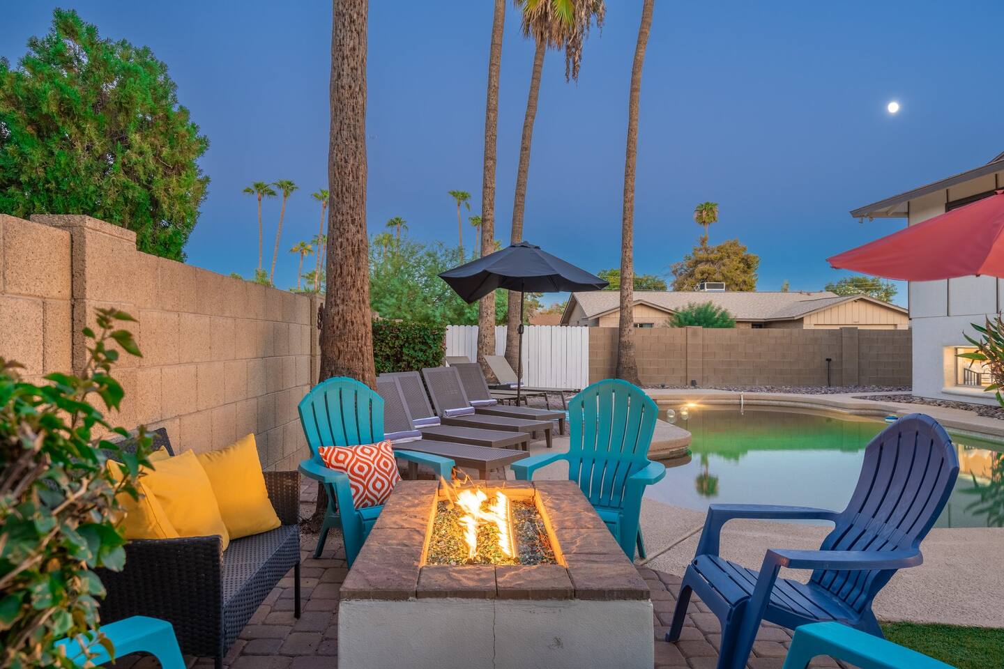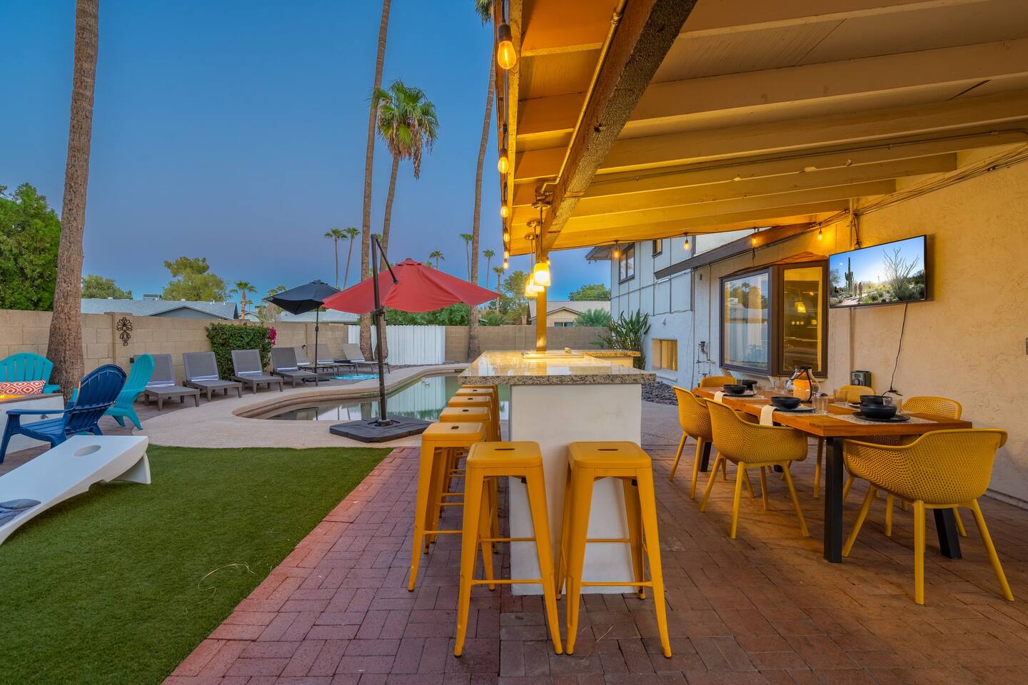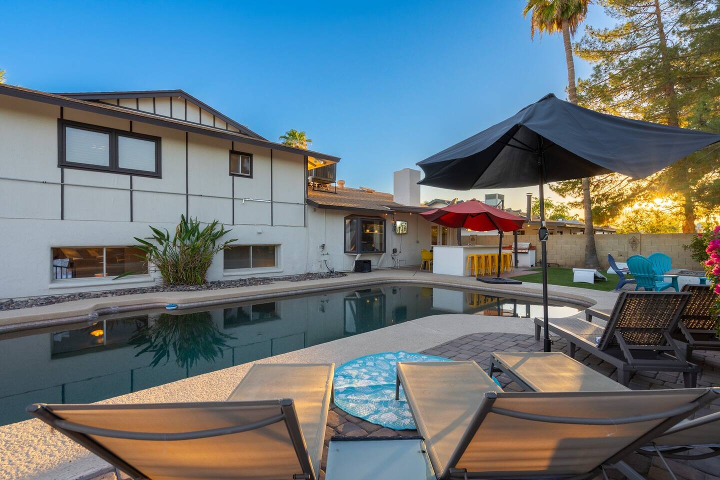 This must be the place! The Scottsdale retreat you have been searching for with all the comforts of home! This handsomely appointed, tri-level home sits on a huge corner lot less than 3 mi. from all the fun and excitement Old Town is famous for. Lounge poolside in the spacious backyard, complete with dining area, large smart TV, built-in gas grill, corn hole, fire pit & ambient lighting. Grab a floatie & veg out in the heated pool or soak your worries away in the relaxing hot tub.
